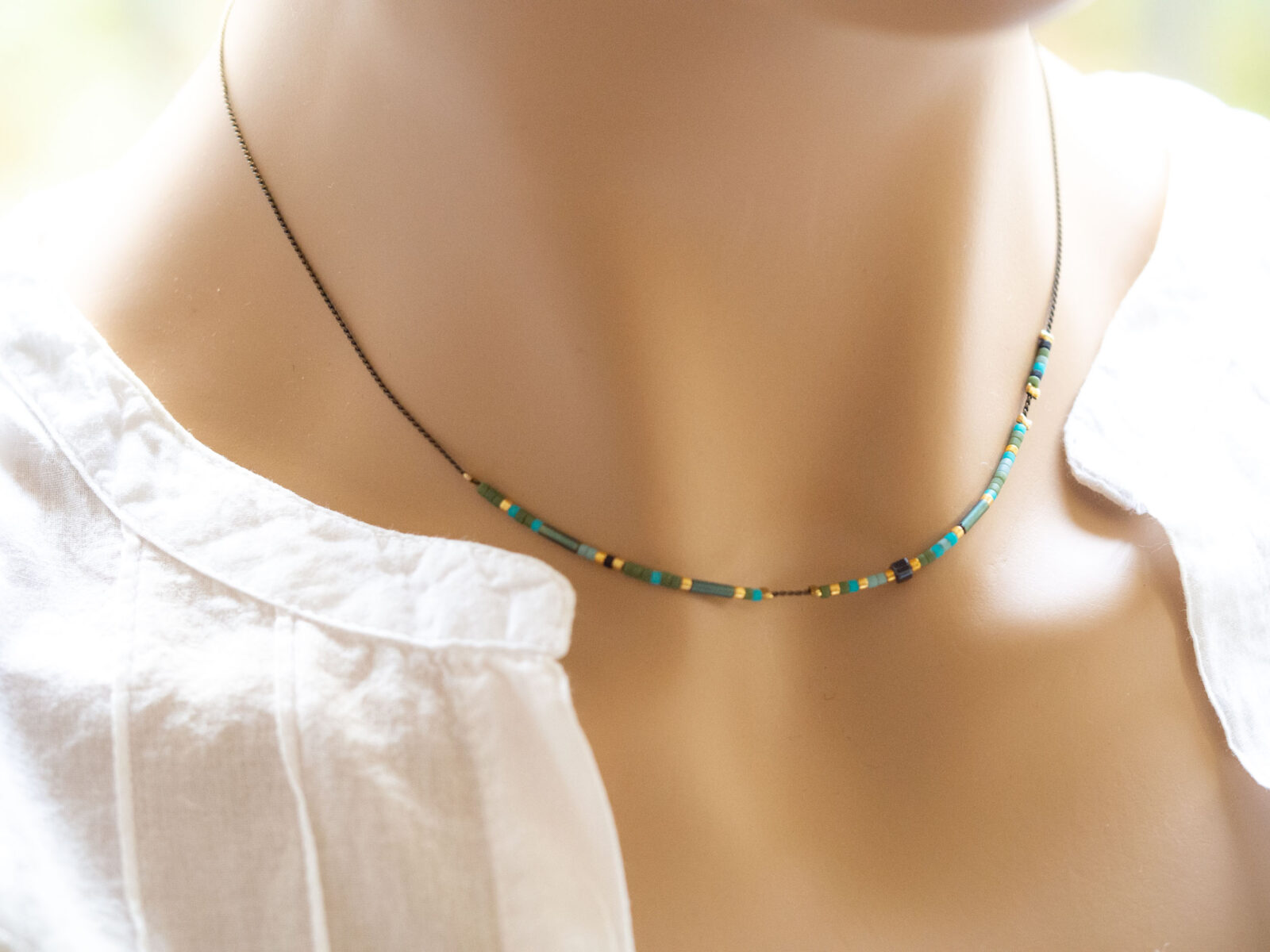 Collier ras du cou, composé d’une très fine chaîne en laiton brut (0,7 mm) agrémentée de petites perles de verre japonaises MIYUKI, dans des tonalités de turquoise, kaki, bronze et doré